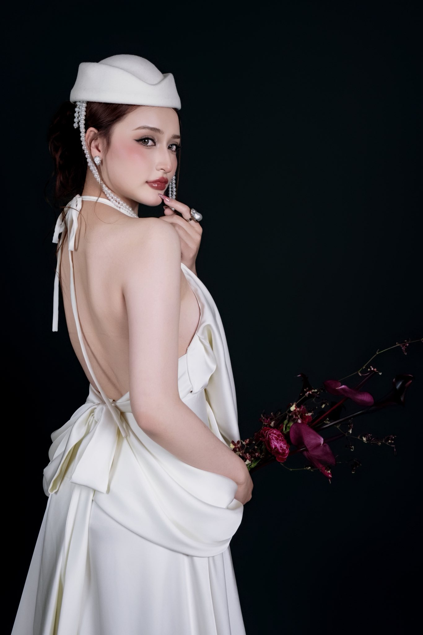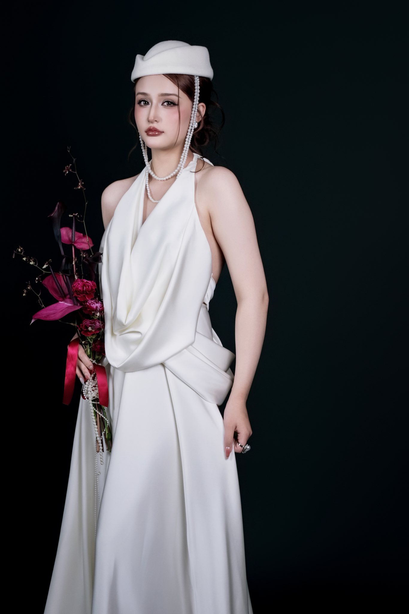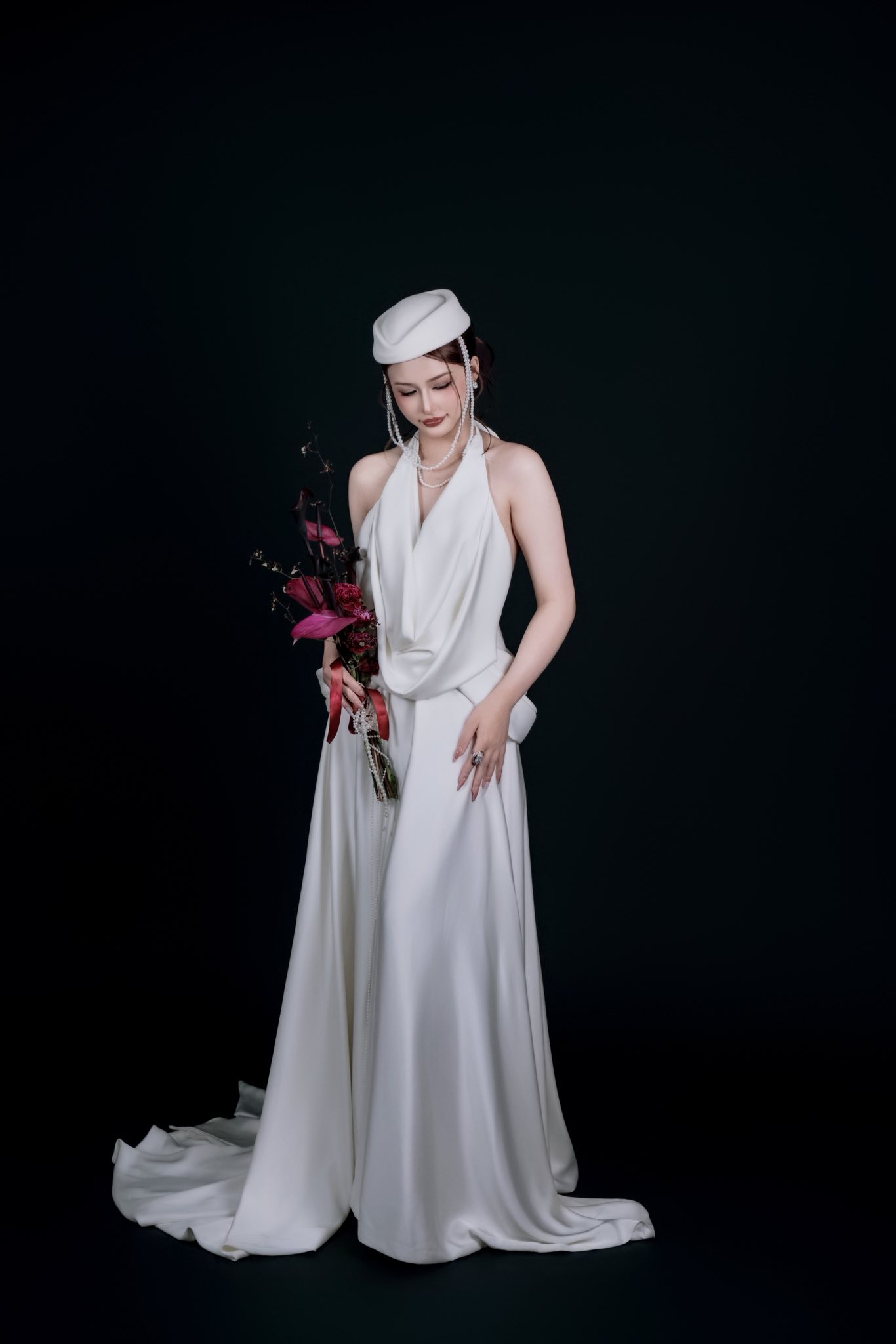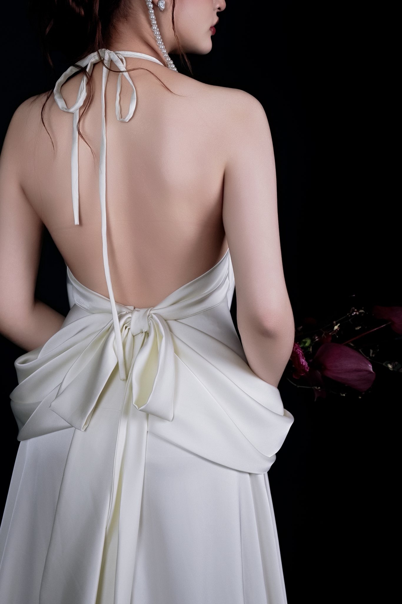 Silent Elegance ✨ Phom váy halter cổ yếm khoe trọn bờ vai và lưng trần quyến rũ, đường cắt tinh giản nhưng đầy tinh tế. Chất liệu satin cao cấp mềm mượt, rũ nhẹ theo từng chuyển động, kết hợp đuôi váy buông dài thanh thoát, tạo nên vẻ đẹp sang trọng, cổ điển mà vẫn rất hiện đại – đúng tinh thần Dreamer Wedding.